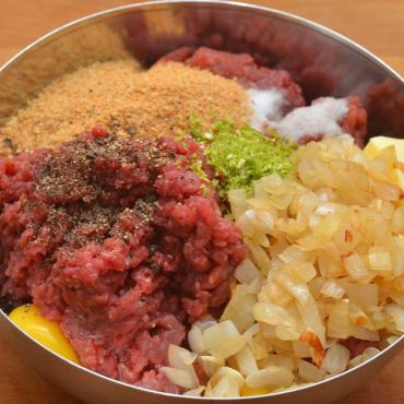 5. Ֆարշի մեջ ավելացնել սոխը, ձուն, աղը, պղպեղը, մշկընկույզը, լիմոնի կեղեւը, հացի փշուրները եւ կարագը:
